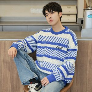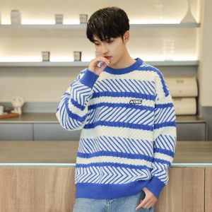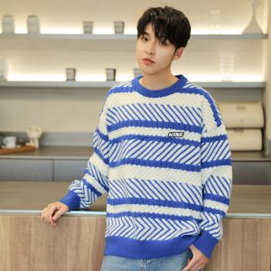 Sweater men’s round neck striped jacquard paragraph sweater casual Korean sweater winter men’s men’s sweater