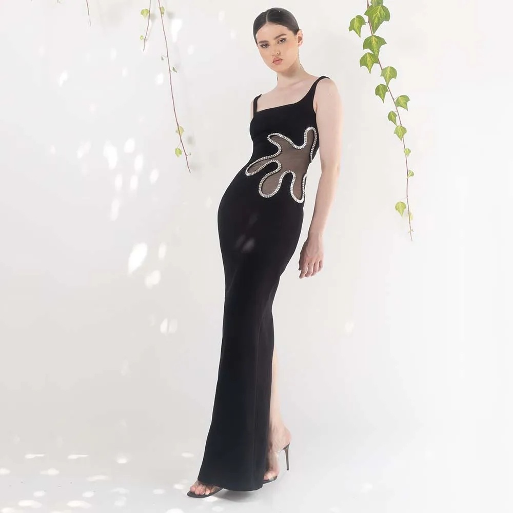 Black sexy sleeveless square neck mesh see-through luxury diamond socialite bandage long skirt