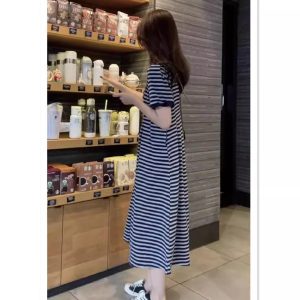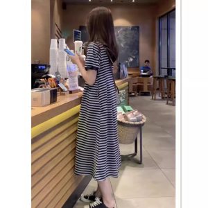 Summer new short-sleeved striped dress women’s oversize T-shirt slimming versatile long skirt Fabric name: cotton Pattern: Stripes Craftsmanship: stitching